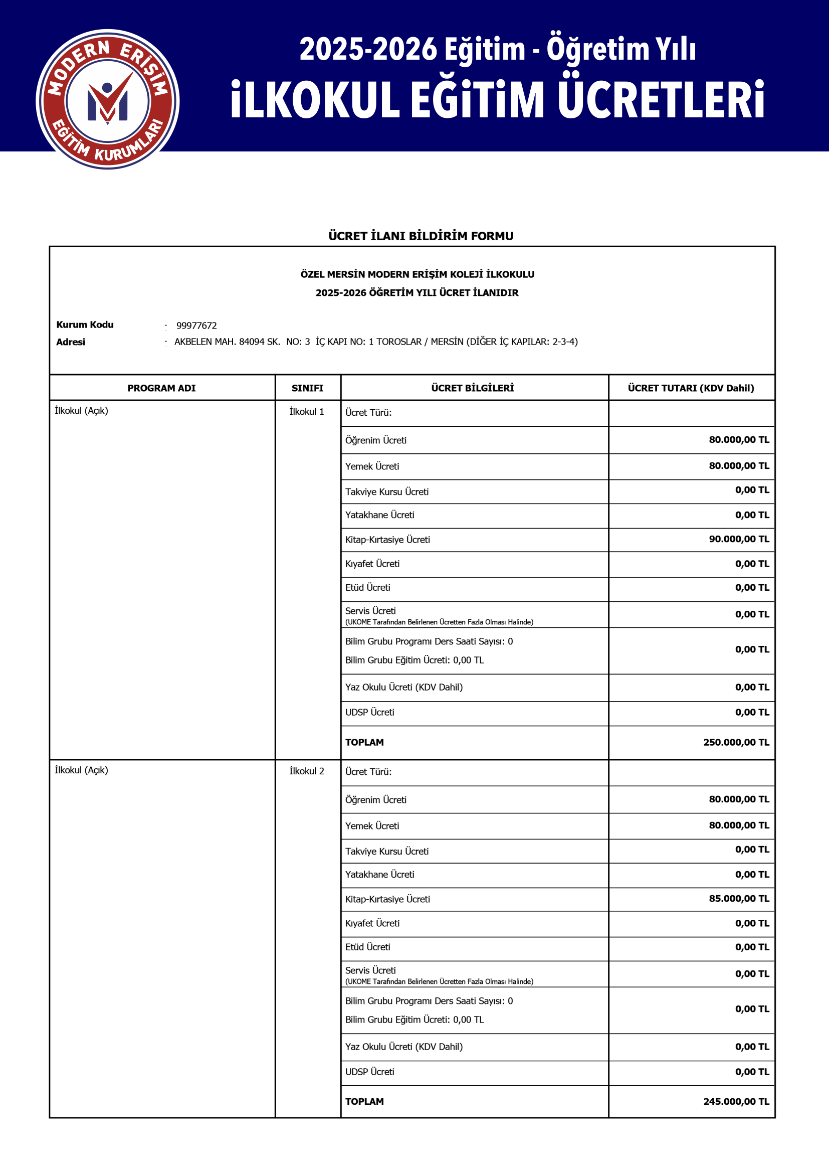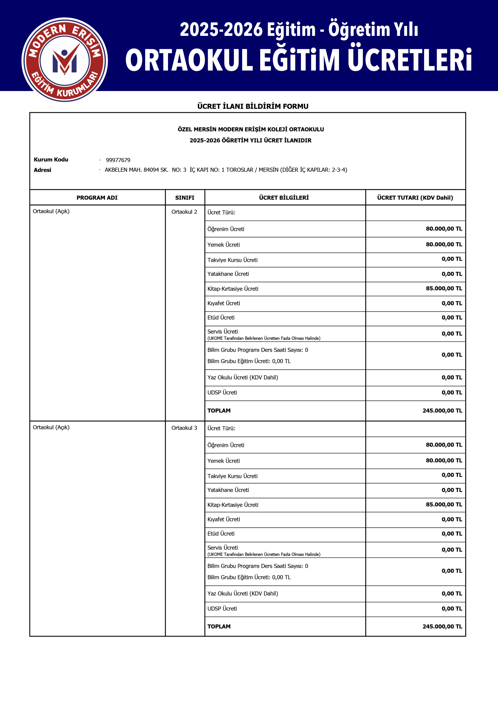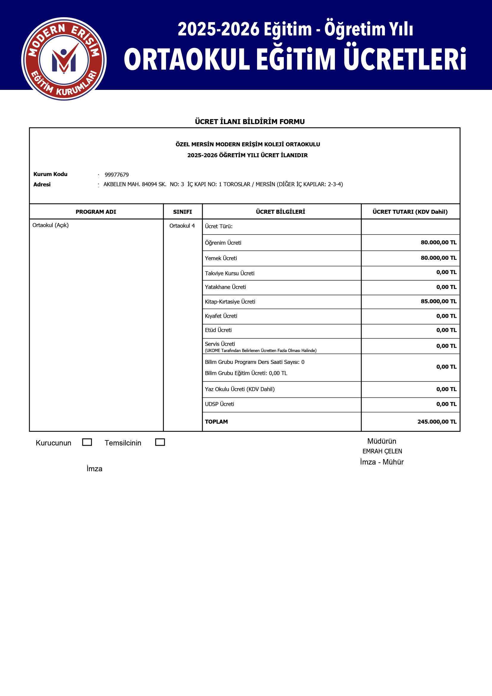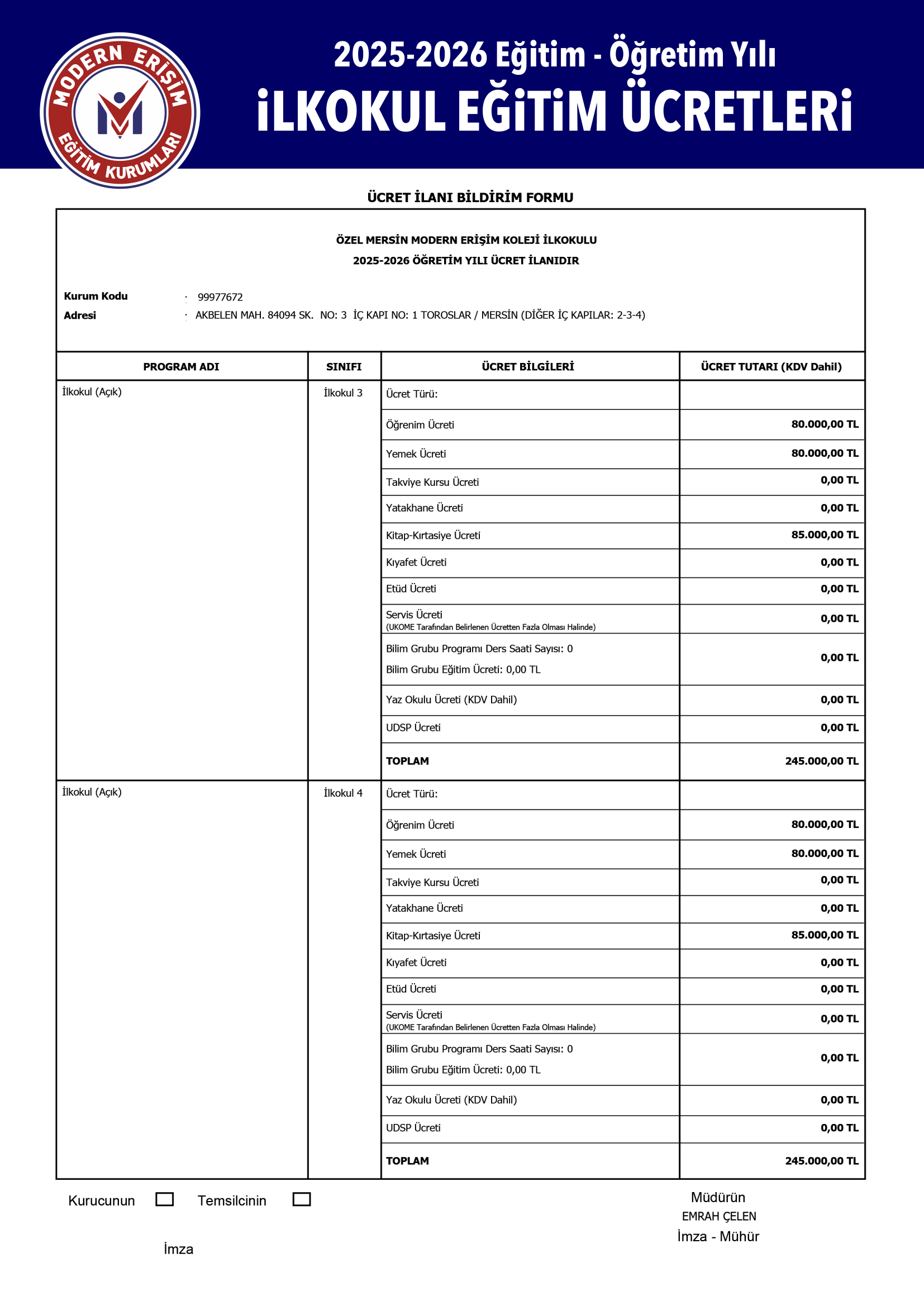 2025 - 2026 Eğitim Öğretim Yılı Ücret İlanı Açıklandı.